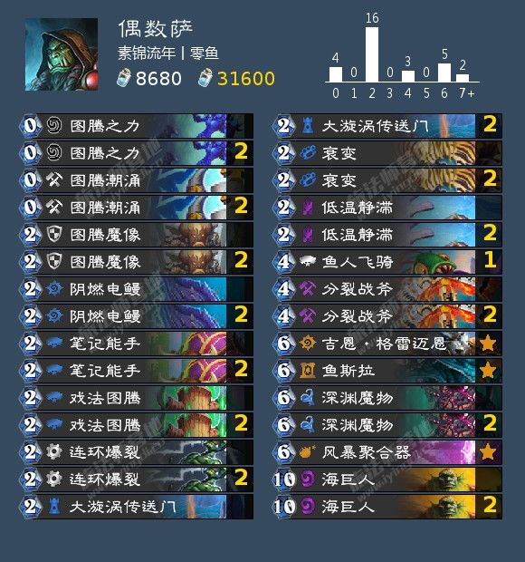 来自素锦流年丨零鱼打进国服前二百的一套偶数萨。这套偶萨在上个版本图腾偶萨的基础上加上新卡戏法图腾,笔记能手和鱼人飞骑。戏法图腾算一张不稳定的上限卡,经常能给你意外的惊喜,也能给你惊吓,把炉石的随机性发挥得淋漓尽致,作者带着的理由主要是真的很快乐,让偶萨不再那么刻板(总有人说偶萨是脚本卡组),三费以下的法术总体上质量是挺好的,不喜欢过于随机的话可以换成更稳定的怪盗图腾。这版本最香的卡是笔记能手,配合两个0费buff可以极大提高爆发力或者加强图腾站场能力,打快攻的时候也能用来回手大漩涡,增加赢面,偶尔能配合连环爆裂来偷鸡,我们很多法术都有再利用价值的。至于鱼人飞骑单纯是作者找不到四费合适的抢节奏单卡罢了,而且用来解暴徒和火妖非常方便。现在花四费下个大哥(指图腾师和477这种)挺难受的,对面完全可以不管或者冰起来,这个卡位给荆棘谷巫师婆,猎风巨龙或者玛维也行的。