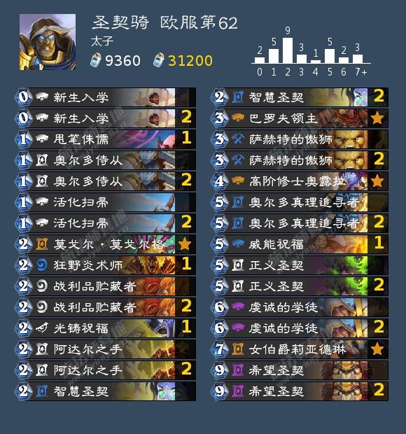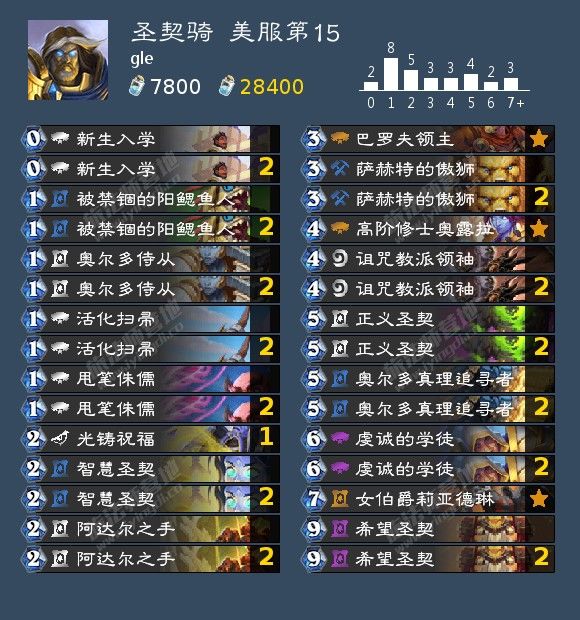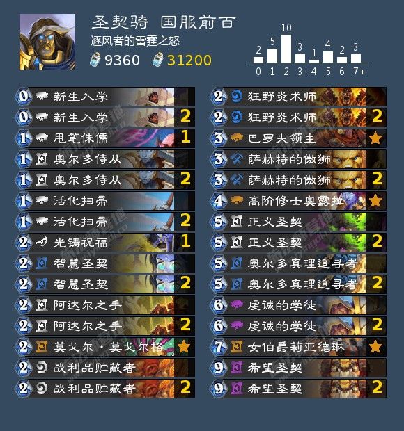 得益于巴罗夫领主、活化扫帚、正义圣契等解牌,圣契骑可以很好地化解(非天胡)德鲁伊的攻势,并利用其解大怪能力的不足进行反击;而在对上碎片瞎时,圣契骑可以很快地建立起一个碎片瞎解不了的复杂场面,而且一干嘲讽和回血也可以反制DH的进攻。因此圣契骑在当前环境更多地作为一个反手卡组拿来使用,而它持续走强的表现也正昭示着德鲁伊与DH的统治力。