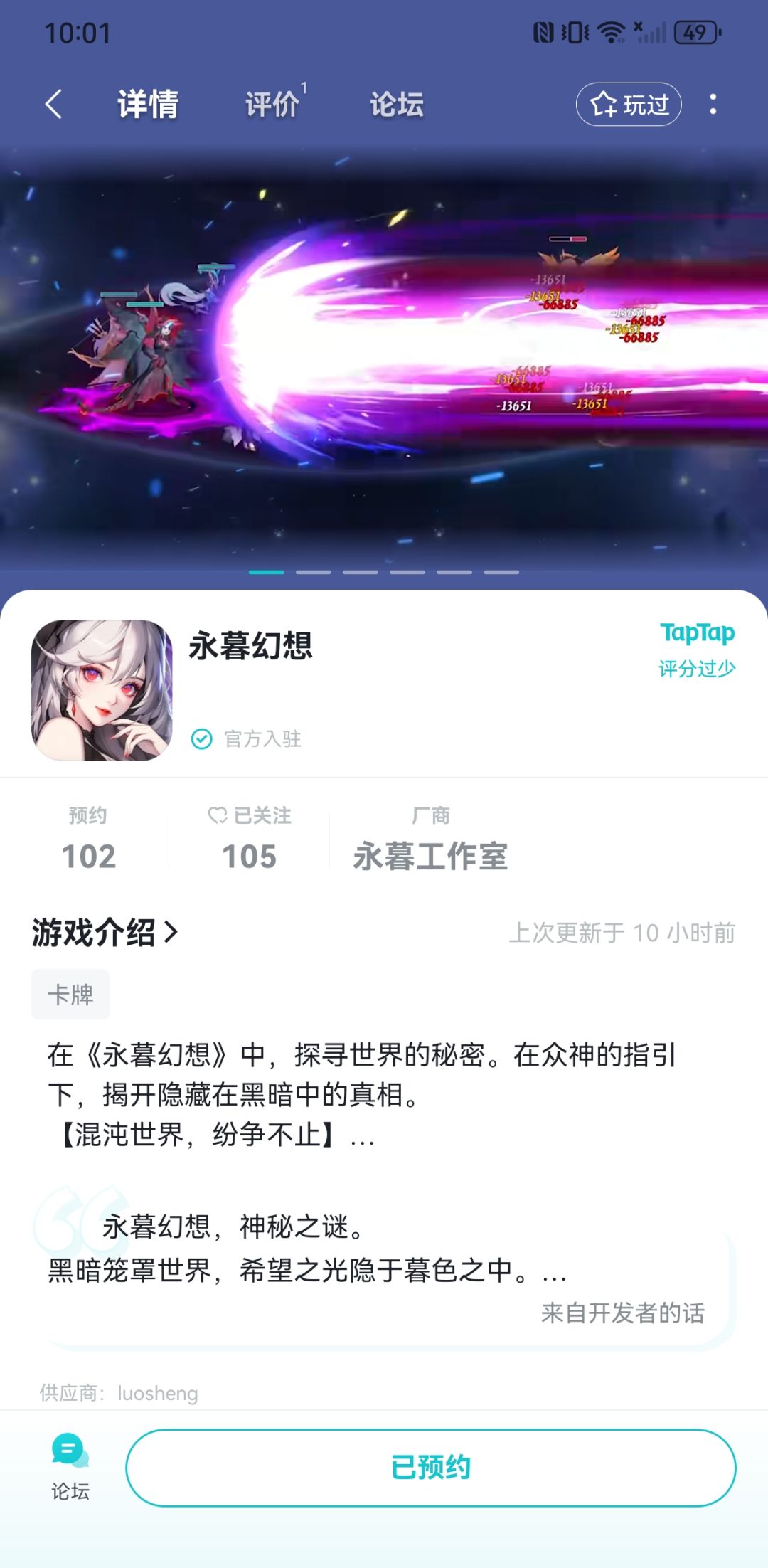 步骤一:点击专区预约按钮关注《永暮幻想》,并截图预约界面。