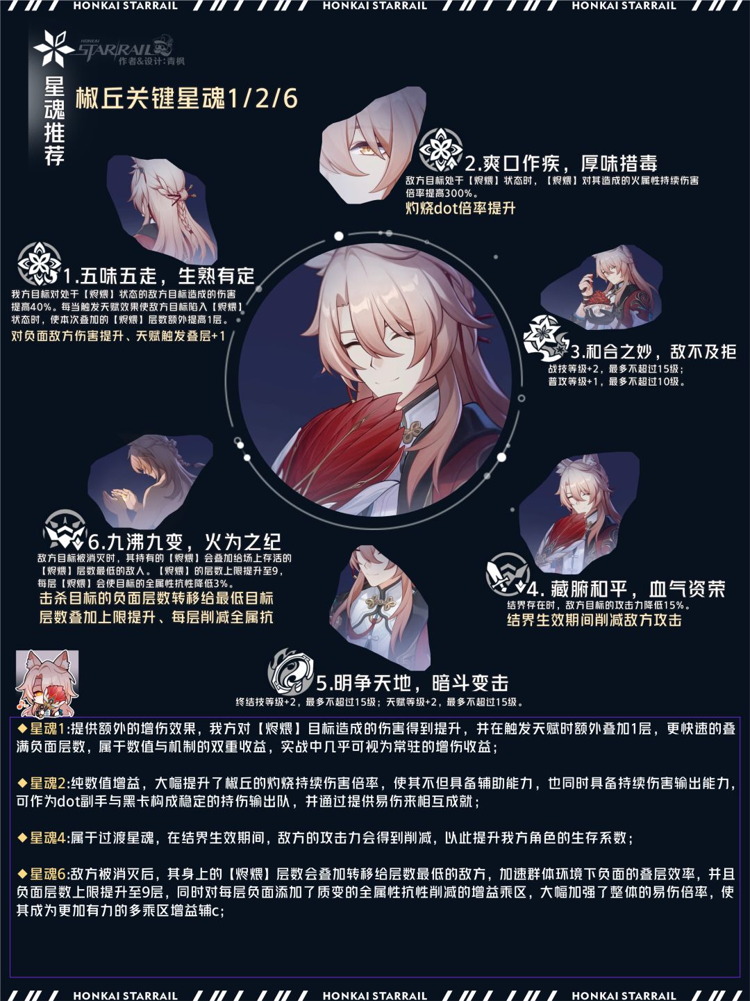 椒丘是一名火属性-虚无命途角色,能够对敌方施加高额易伤、终结技易伤的辅助增益,其施加的负面效果频率高且覆盖稳定,所提供的光环减益辅具备一定的同谐气质,对于刚需负面判定的输出角色而言有显著提升,而由于是珍贵的易伤乘区,也意味着椒丘具备较强的泛用性,同时自身也能造成火属性持续伤害,并通过命中的加持转模攻击收益,提升灼烧dot倍率,这位颇有心计的眯眯眼辅佐能力不俗~可灵活就业于目前各种主流队伍当中;#崩坏星穹铁道创作者激励计划 #明霄竞武试锋芒 #椒丘 #