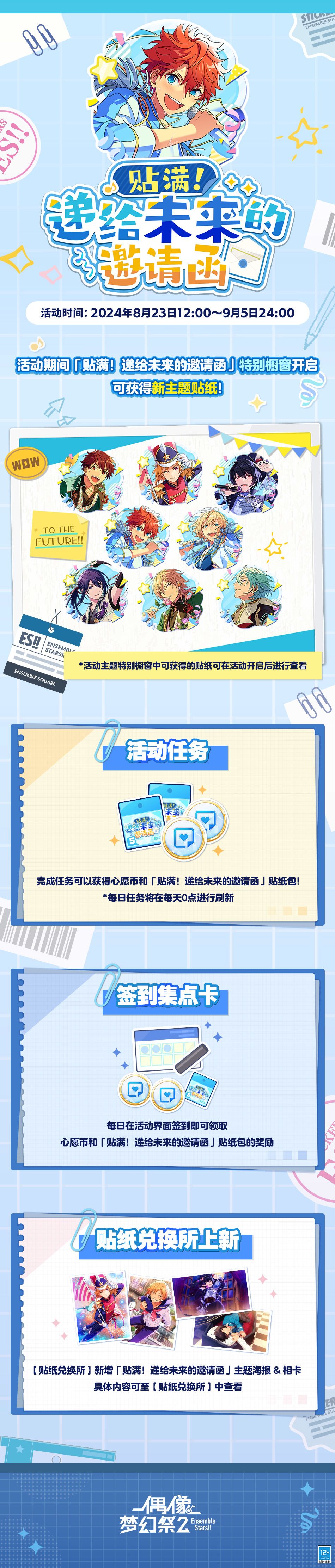 8月23日12:00起贴纸商店将上新「贴满!递给未来的邀请函」主题海报、相卡及主题装饰、背景类贴纸。