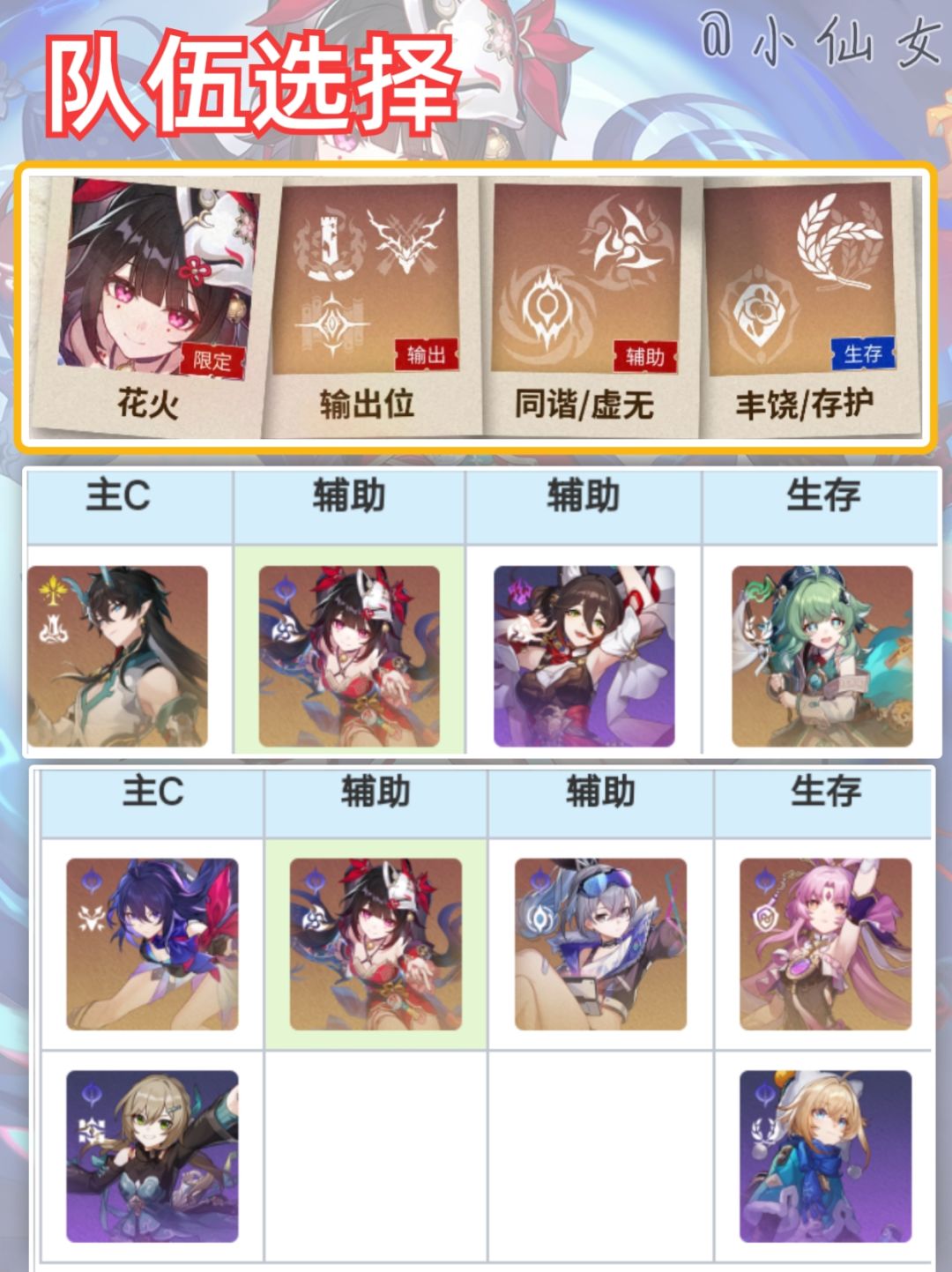 「花火」是一名同谐命途量子属性的五星限定角色。能够提供增伤、暴伤、攻击、拉条、产点等辅助能力,并且能够提高战技点储存上限。般在队伍中作为辅助位。