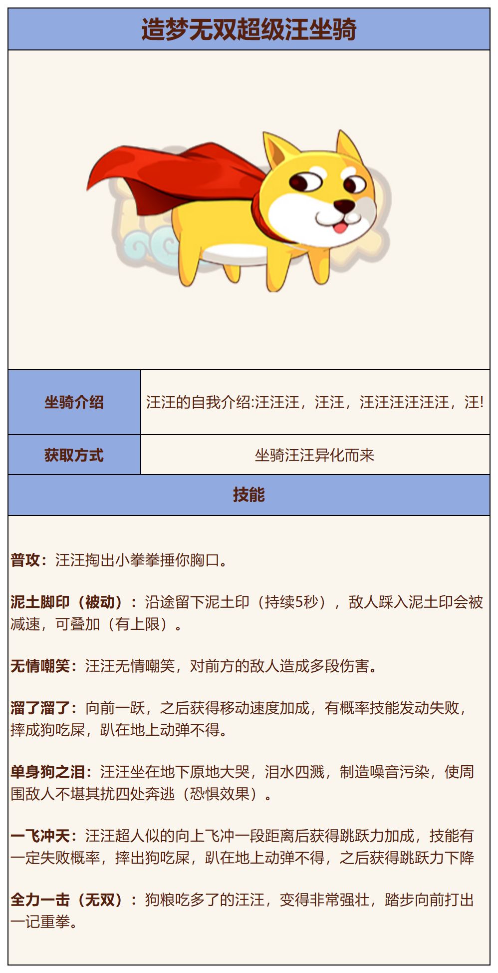 【坐骑攻略】造梦无双超级汪坐骑技能表