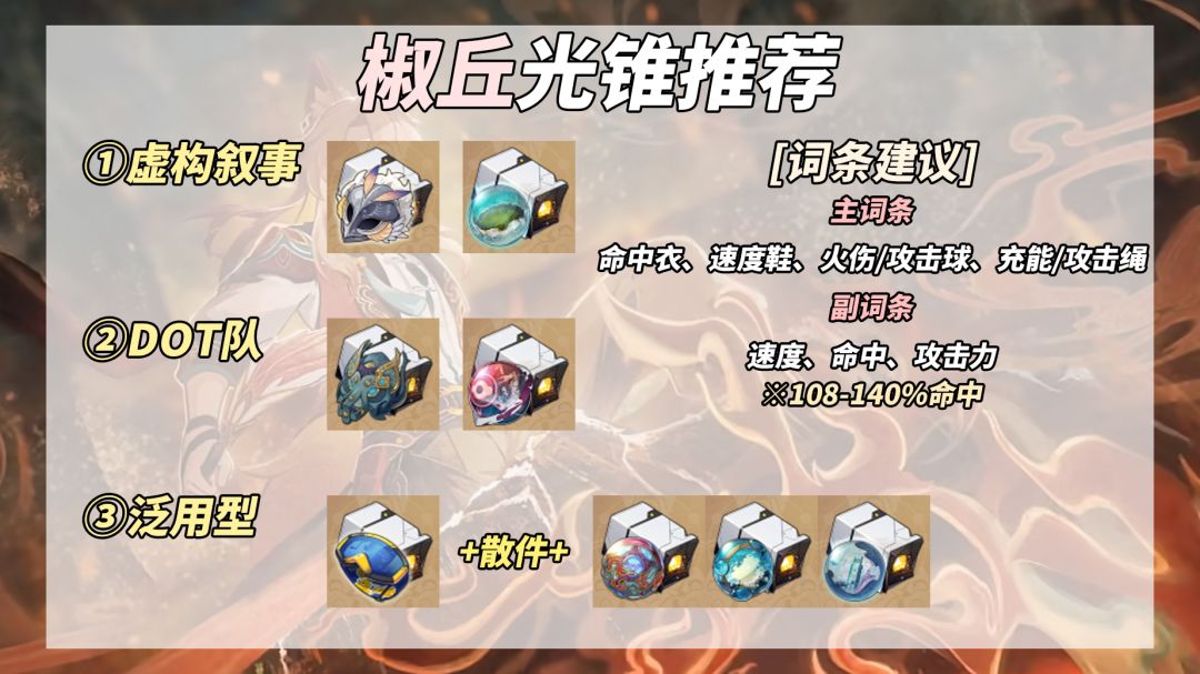 ①0+1。椒丘光锥‘那无数个春天’可极大降低对命中词条的需求,并提供24%易伤全队实打实的提升。