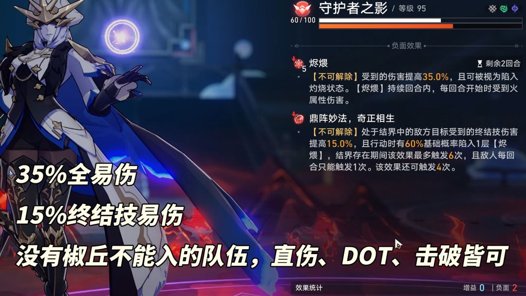 从易伤适用性角度来看,椒丘可入任意队伍,直伤、DOT、击破皆可,易伤都属于有效增益。