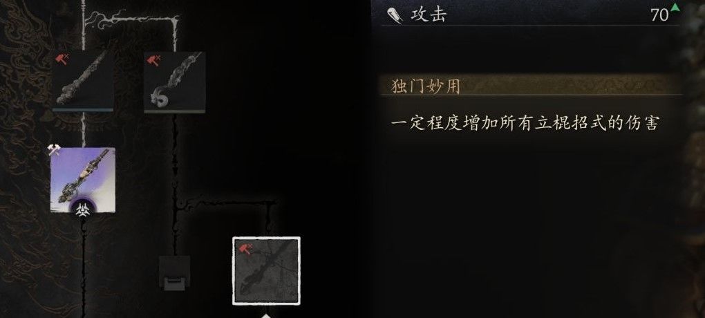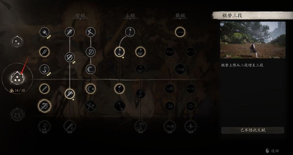 棍法主点的劈棍,其他两种感觉使用场景不太广,就没去专门投入深层加点。但要注意,在棍法上,请务必要投入10个技能点,解锁棍式三段!