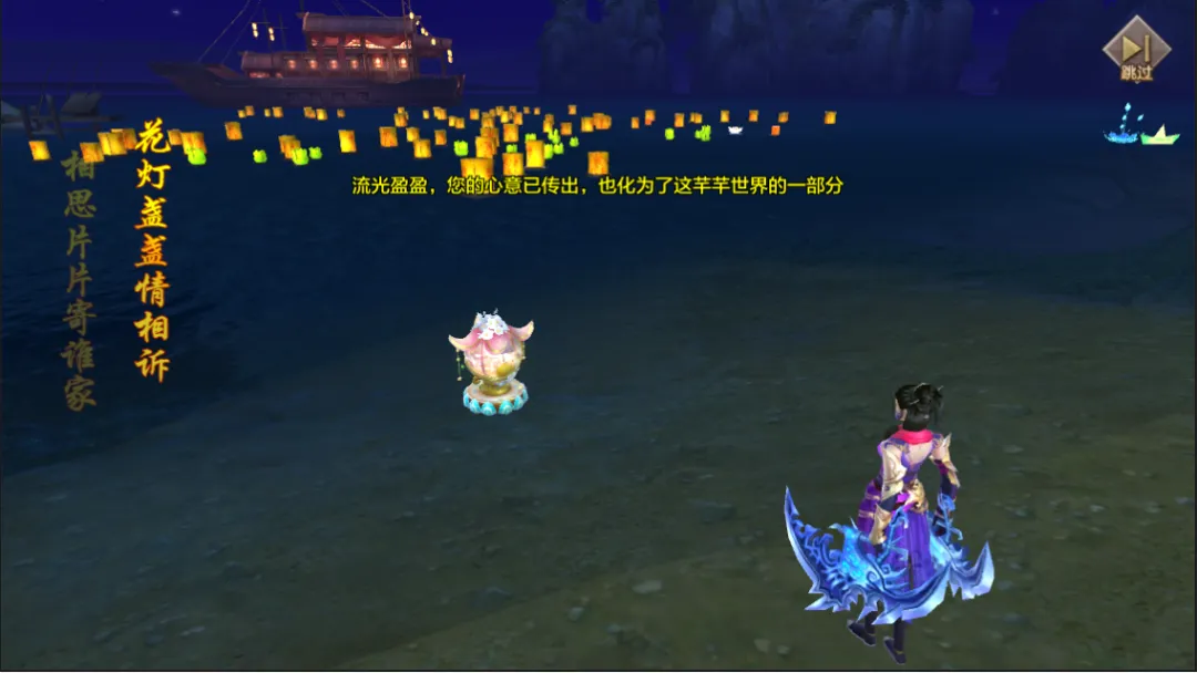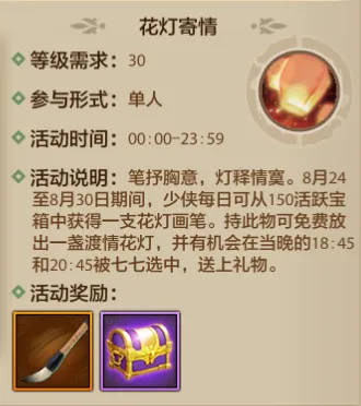 在江湖中斩妖除魔的时候,也要记得来老赵这里参与浪漫的活动哦。七夕虽过,思心犹盛,笔抒胸意,灯释情寞。在8月24日-8月30日期间,等级不低于30级的少侠,每日可从150活跃宝箱中获得一支花灯画笔。持此物可免费放出一盏渡情花灯,并有机会在当晚的18:45和20:45被七七选中,送上礼物。