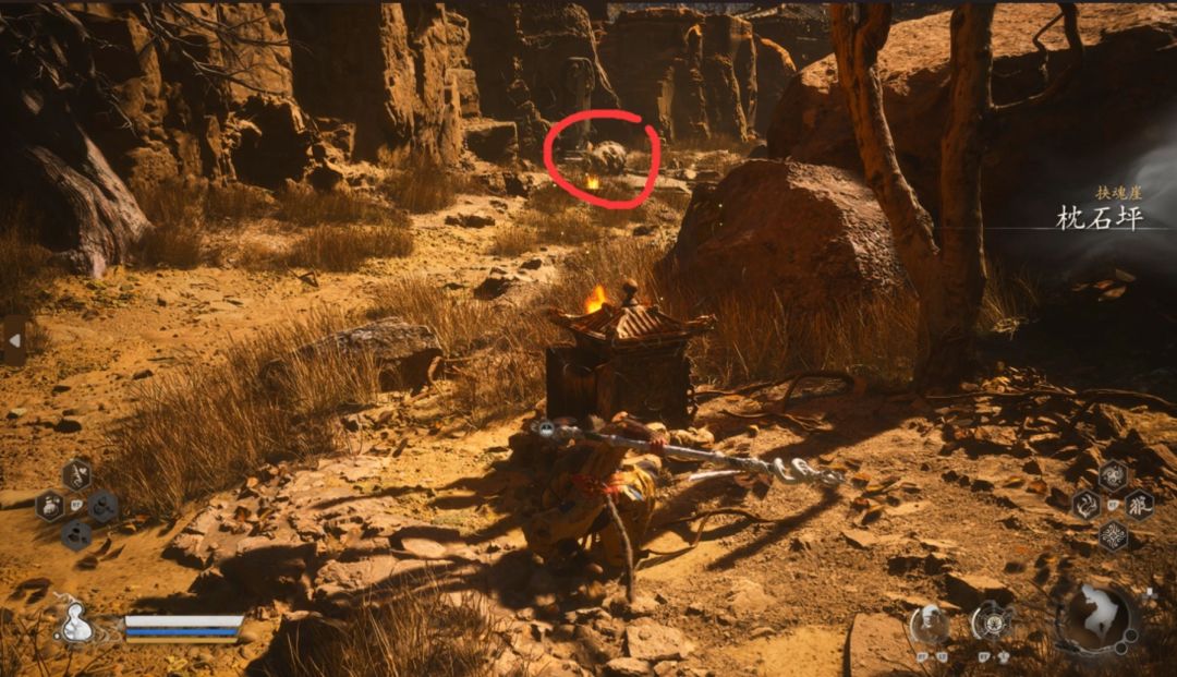 在黄风岭地图找齐六个佛像,枕石坪传送点左侧有一块石头,互动即可复活石敢当,击败后即可获得成就