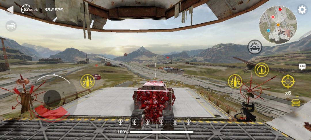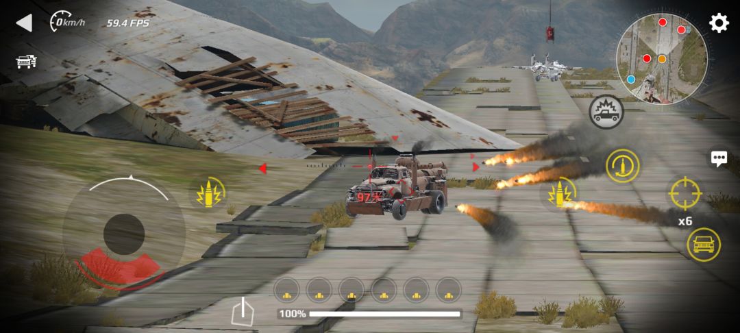 随时与敌人保持适当距离,先围绕着地图外面跑图,远程看见人就开启瞄准镜发射一波导弹,边跑边打,两只手玩的话右手瞄准镜一开一关,左手不要去动方向盘,定速巡航会自己跑,左手只需要按发射就行了,右手开镜这样子操作上更协调。导弹只要开镜发射了就不需要你去瞄准记住这一点。重点是(这款车即便是翻车了也会自己弹起来摆正自己)!老六用它偷袭打击非常顺手!