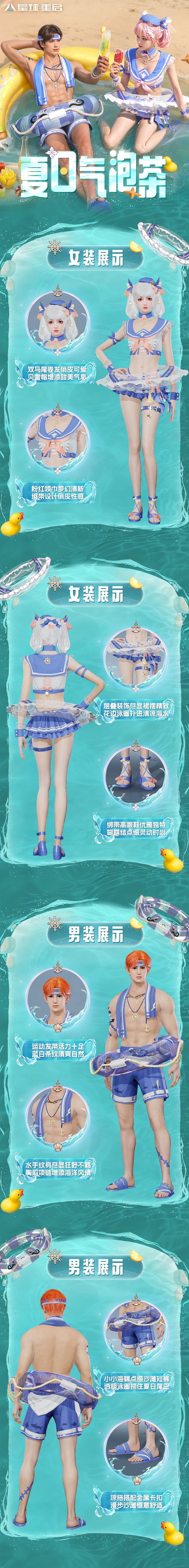 夏日奇遇,带你畅游海边~「夏日气泡茶」时装包含头部、上衣、下衣、手部、鞋子共五个部位,女款粉红色领巾梦幻清新,绑带设计俏皮又性感,层叠装饰精致动人,花边泳圈增添轻盈感;男款蓝白条纹发带清爽自然,水手纹身展现狂野风格,胸前的海洋风情项链和小海螺装饰沙滩短裤相得益彰。透明泳圈让你在夏日的尾巴上尽情畅游。