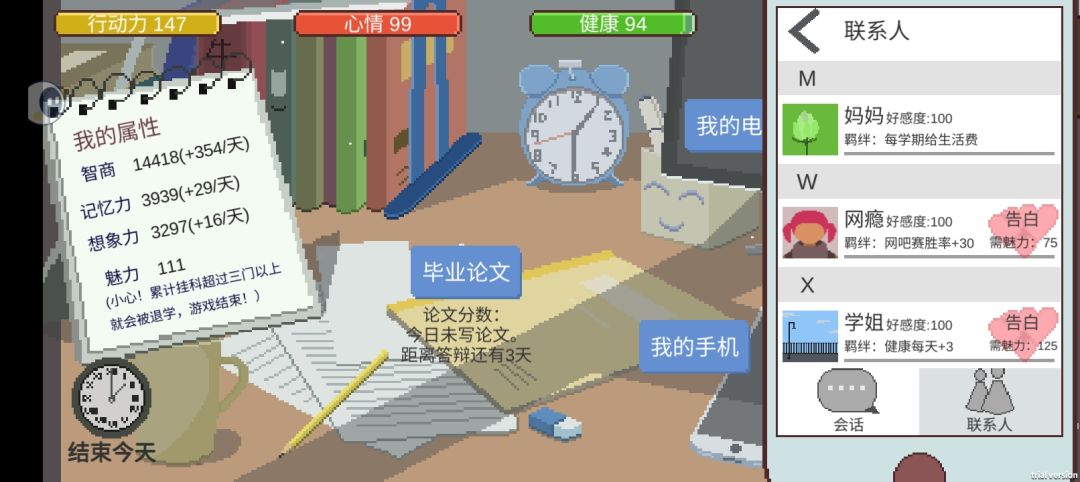 游戏是一定要打的 但只限于和室友 (自己打废体力) 魅力值卡到100就可以了 每天的体力必须拿完(如吃牛排 喝咖啡 不在就去健身房 网吧的热狗 沙发 )每天都要兼职 别想着西装的兼职 没性价比 接下来就是学习 和室友打游戏 刷亲密度 上培训班(主要是智力) 基本上是全部满分