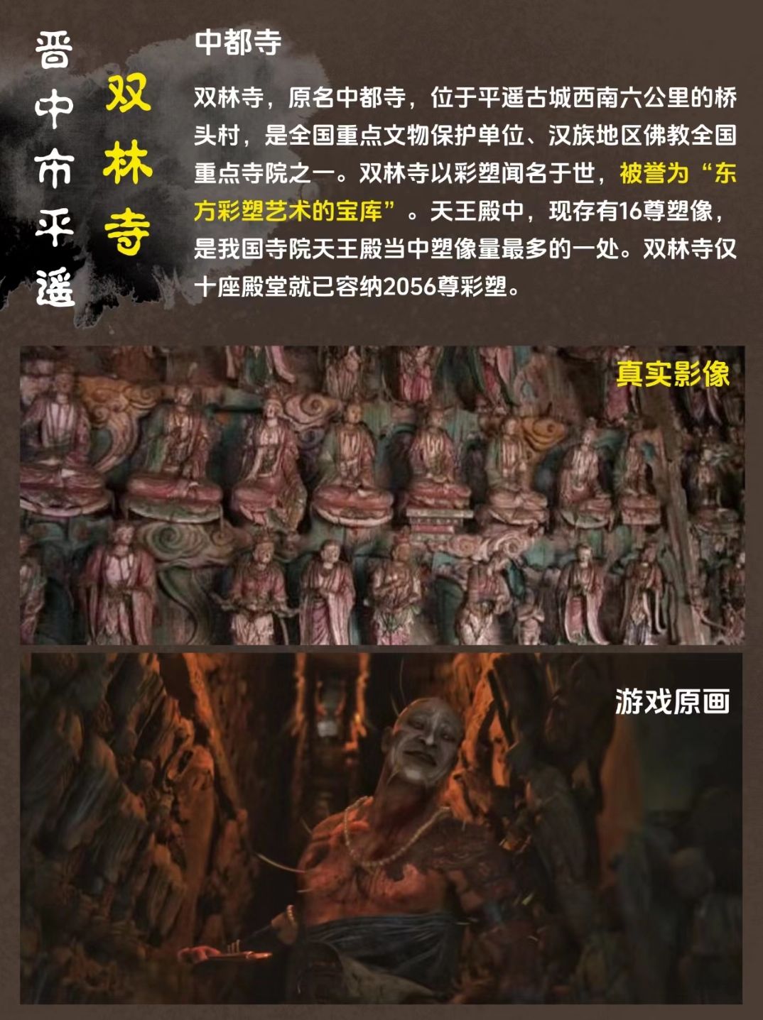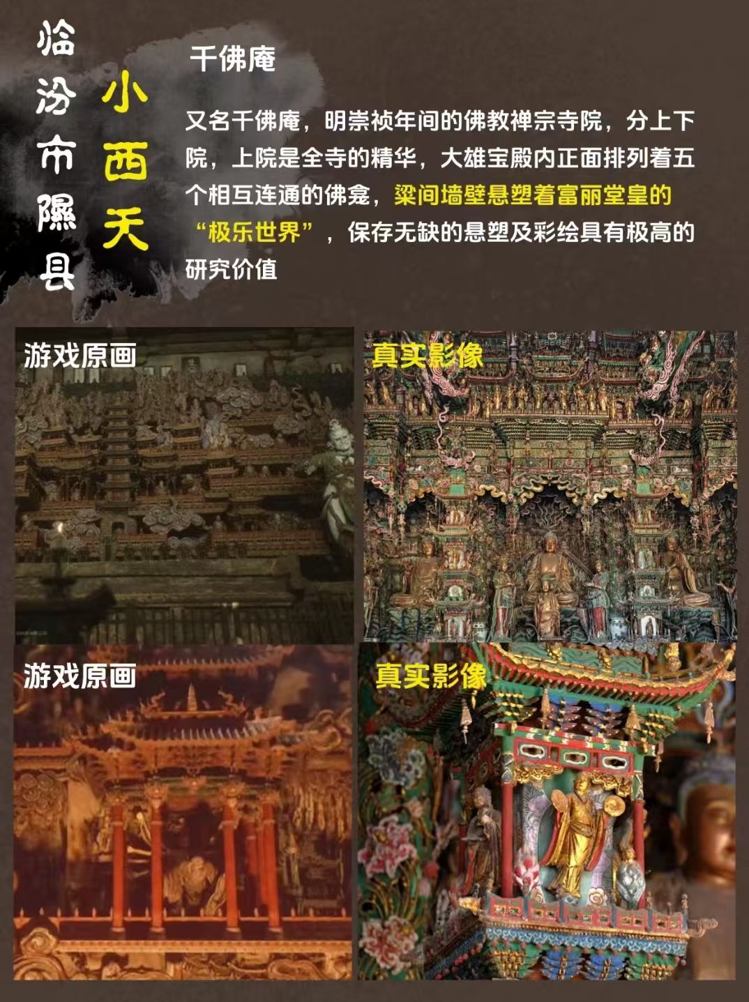 如果你被游戏里的场景,雕塑和人物震撼住了那么你一定会被山西晋北晋南的古建吸引!小西天、悬空寺、双林寺、玉皇庙…