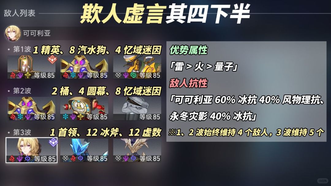 优势属性「雷>火>量子」,敌人抗性「可可利亚60%冰