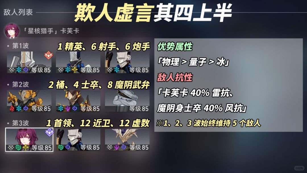 优势属性「物理>量子>冰」,敌人抗性「卡芙卡40%雷抗、魔阴身士卒40%风抗」。上半无太大压力,敌人特性并不复杂无需过多关注~