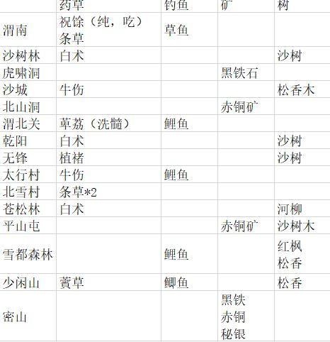 白术和洗髓丹制作材料比较重要,精力丹可以等待自行恢复,图里有一些资源点(图为曹操传大司马制作,有一些遗漏,我也懒得补充),特别注意的是,去昆仑派的路上,有个地方能采集洗髓材料。