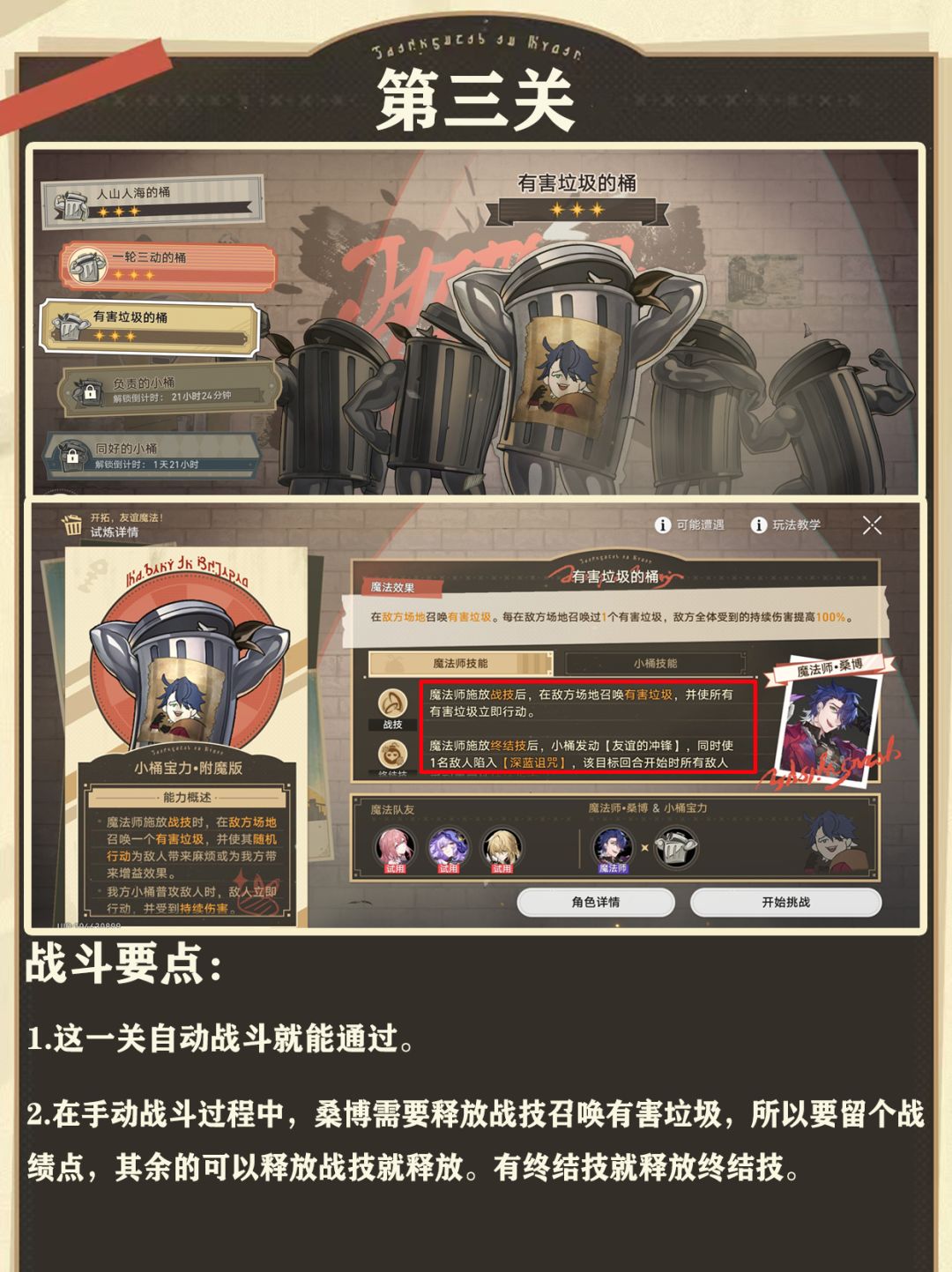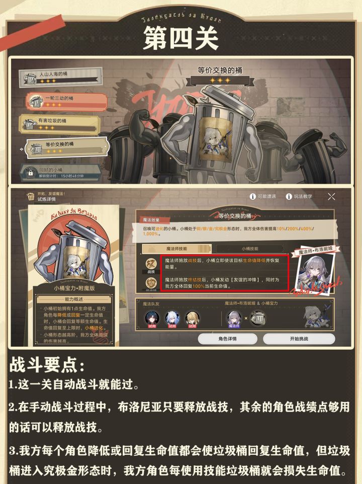 第四关:这一关自动战斗也能过。手动的话主要靠我方角色不断损失和回复生命值加快垃圾桶的进化,以此提高我方全体伤害。