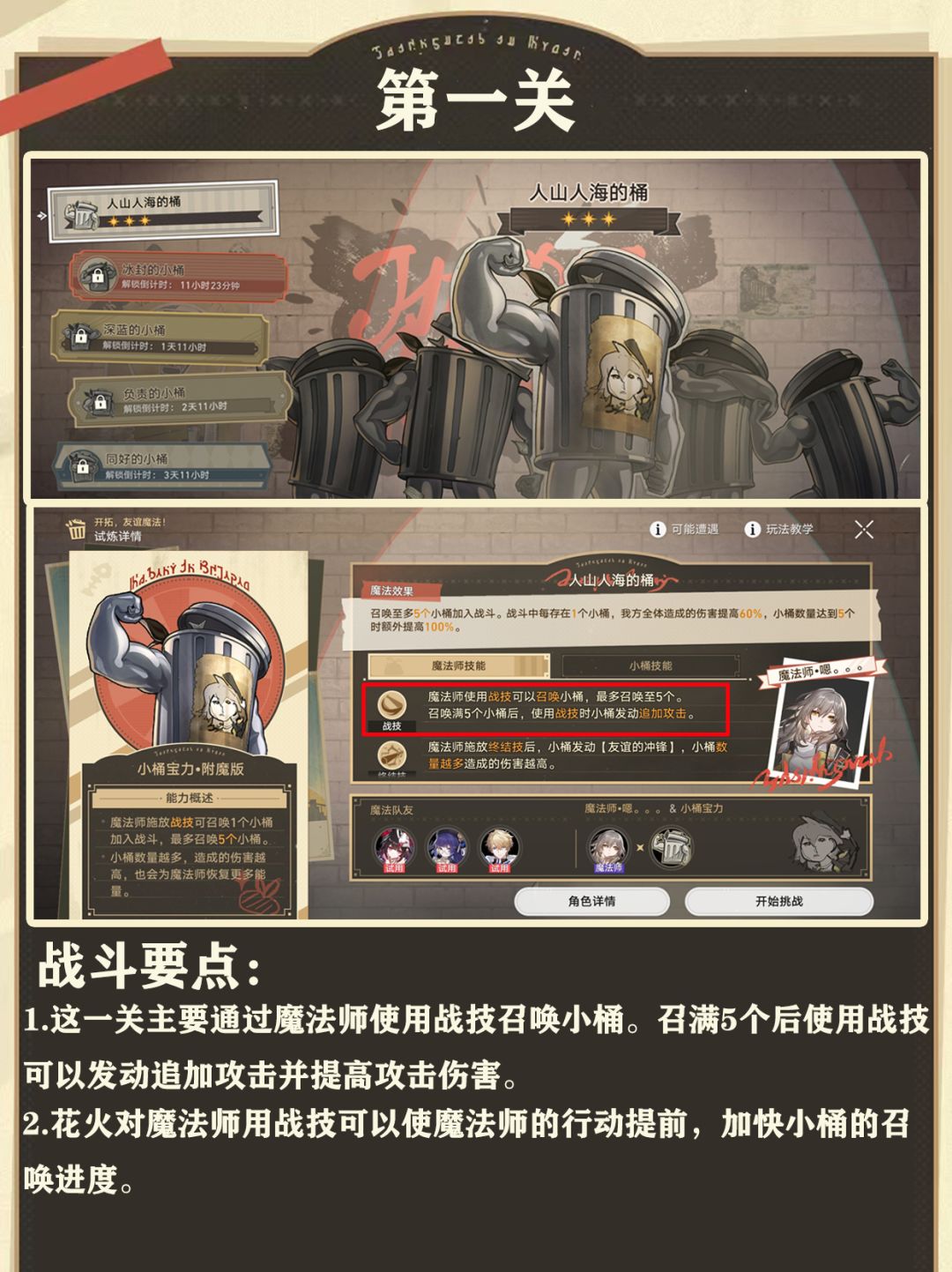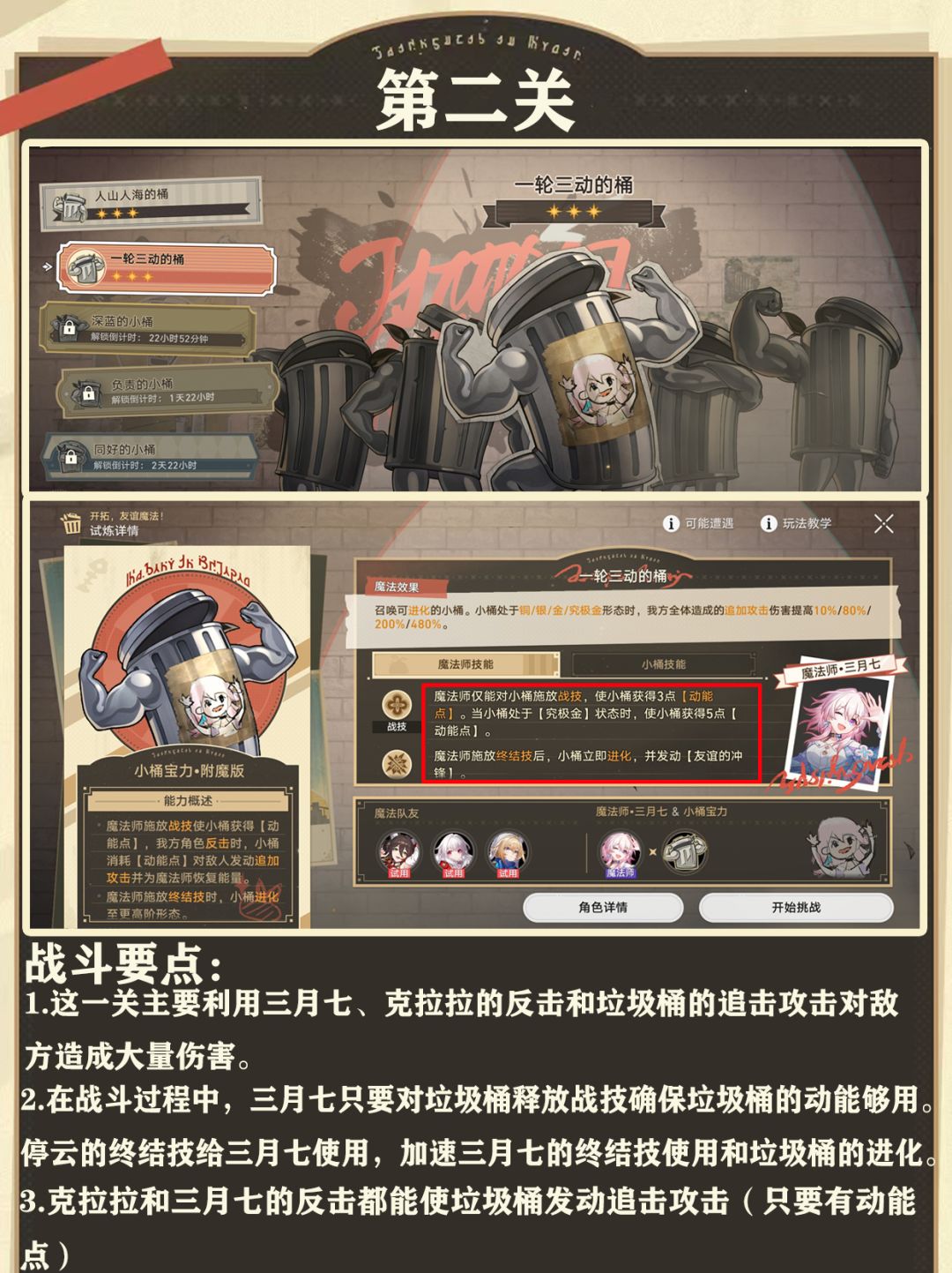 第五关:这一关主要靠我方角色施放终结技为垃圾桶充能,使垃圾桶发动自爆冲击提高我方全体伤害。