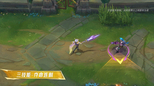 菲奥娜为剑充能,强化随后的2次普攻,并提升自身攻击速度。充能期间剑身泛起紫色流光特效,第一次普攻无法产生暴击但会降低敌人移速,并伴有亮紫色爆炸光效打击效果。
