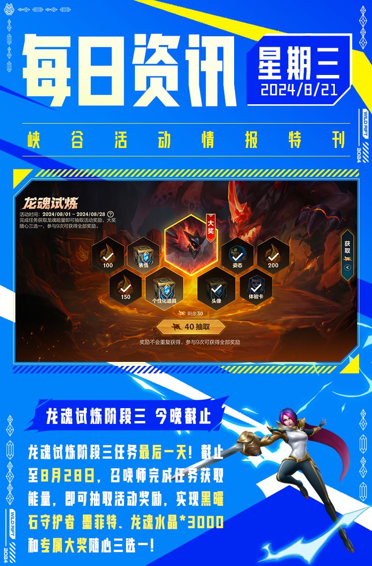 奖励:天赋觉醒系列皮肤,玉剑传说 苍鸾 莫甘娜,神龙守卫 加里奥,全英雄畅玩卡,7天随机皮肤宝箱,双倍晶石卡,龙魂水晶*88