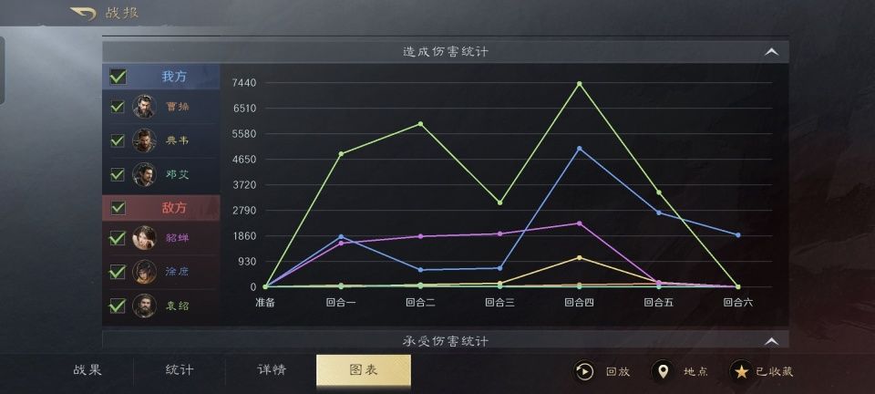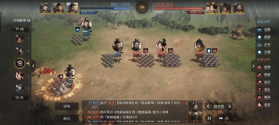 袁绍和徐庶的先攻值高于对面曹操、典韦和邓艾,因此他们掌握了速度上的优势。虎卫方面还没来得及出手,就率先被袁、徐二人打掉了非常多的兵力。邓艾成了第一个倒下的角色,随后曹操也跟着祭了,留下典韦自然蹦跶不了多久。典韦的万夫莫当、勇冠三军和普攻全部打在貂蝉的身上,几乎掀不起浪花,整场的总伤害量才1400多。袁绍和徐庶加起来,已经突破了36000,岂不是分分钟灭了虎卫。