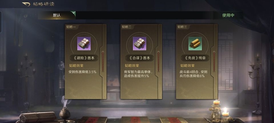 由于袁绍和貂蝉属于群雄,徐庶属于蜀汉,故而袁绍的韬略库没有选择研读金书世家。避险、合谋的善本和先战的残章虽然不是金色的,倒也是具备实用价值的,还能再给智力最高的徐庶提升5%的伤害。至于长弓兵的特性和专精,则点亮了洞悉和袍泽同心。