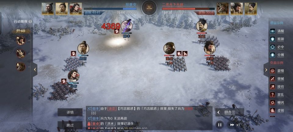 二弟天下无敌此战摆出的是箕形阵,身在前排当肉盾的董卓,在权倾朝野之后还搭配了横征暴敛和战八方,可谓是兼顾了挨打、输出、增伤和回血。