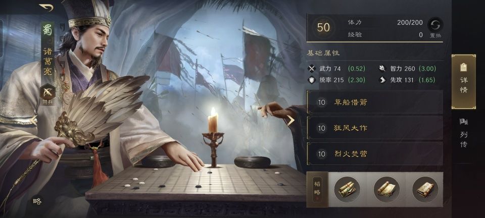 诸葛亮和刘备身处鱼鳞阵的后排,凭借着阵法的加持效果,他们得到的是8%的奇谋提升。草船借箭之后,诸葛亮额外习得了狂风大作和烈火焚营,韬略库研读的三本书依次是出师表、略地和玄机的善本,这些都是用来提升谋略伤害效果的。