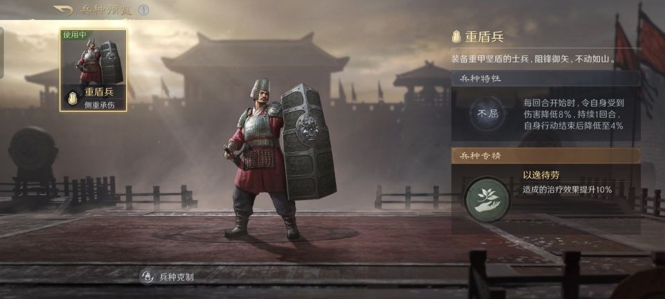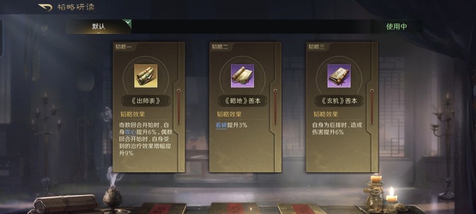 刘备的韬略库里,依次研读了临峰、受势和励军的善本,赵云和他自己都得到了额外减伤和治疗效果的提升。重盾兵同时点亮不屈和以逸待劳,加上韬略的数据,刘备的治疗增幅总共得以提升16%。