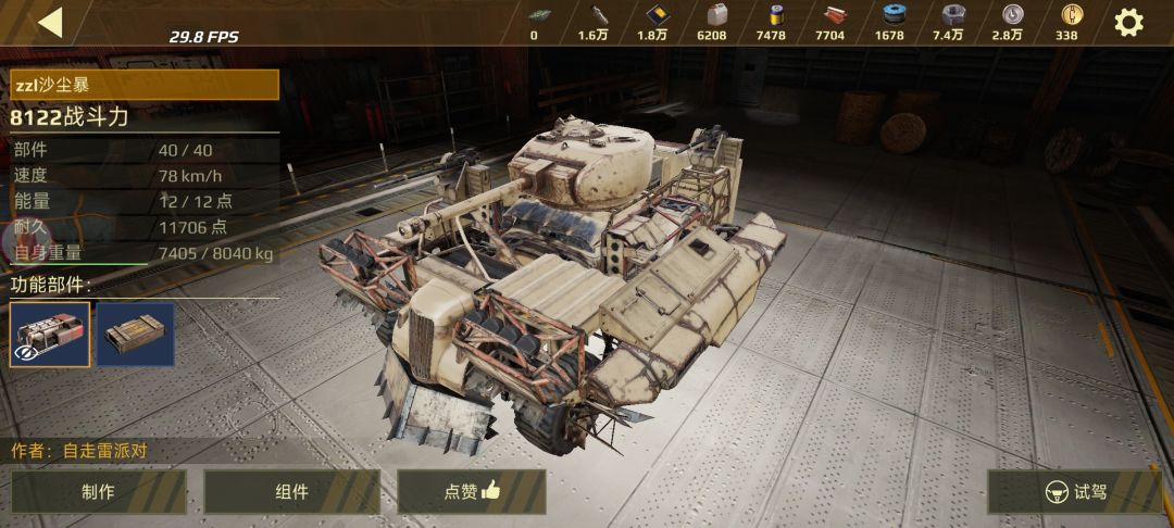适合垫高的结构一般需要有较高的耐久,不容易被击落。虽然武器本身耐久较高,但支撑其的结构块一旦掉落,那缺少与车身连接的武器会立即掉落。