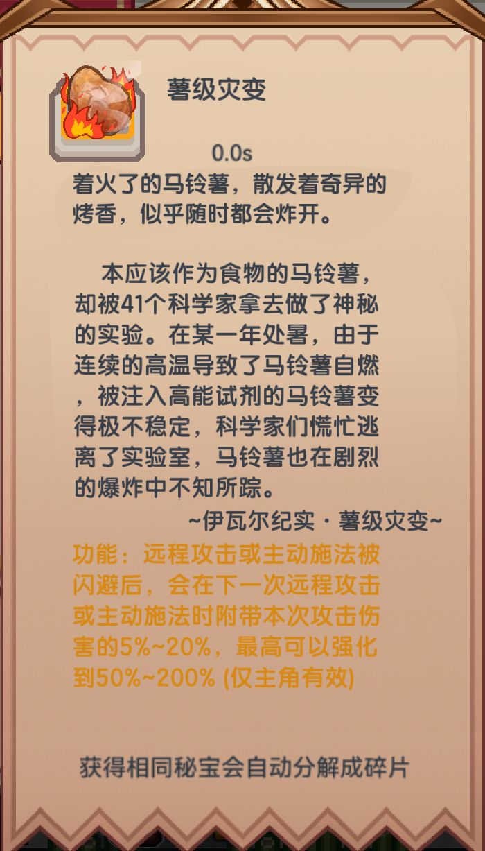 描述:着火了的马铃薯,散发着奇异的烤香,似乎随时都会炸开。本应该作为食物的马铃薯,却被41个科学家拿去做了神秘的实验。在某一年处暑,由于连续的高温导致了马铃薯自燃,被注入高能试剂的马铃薯变得极不稳定,科学家们慌忙逃离了实验室,马铃薯也在剧烈的爆炸中不知所踪。功能:远程攻击或主动施法被闪避后,会在下一次远程攻击或主动施法时附带本次攻击伤害的5%~20%,最高可以强化到50%~200% (仅主角有效)