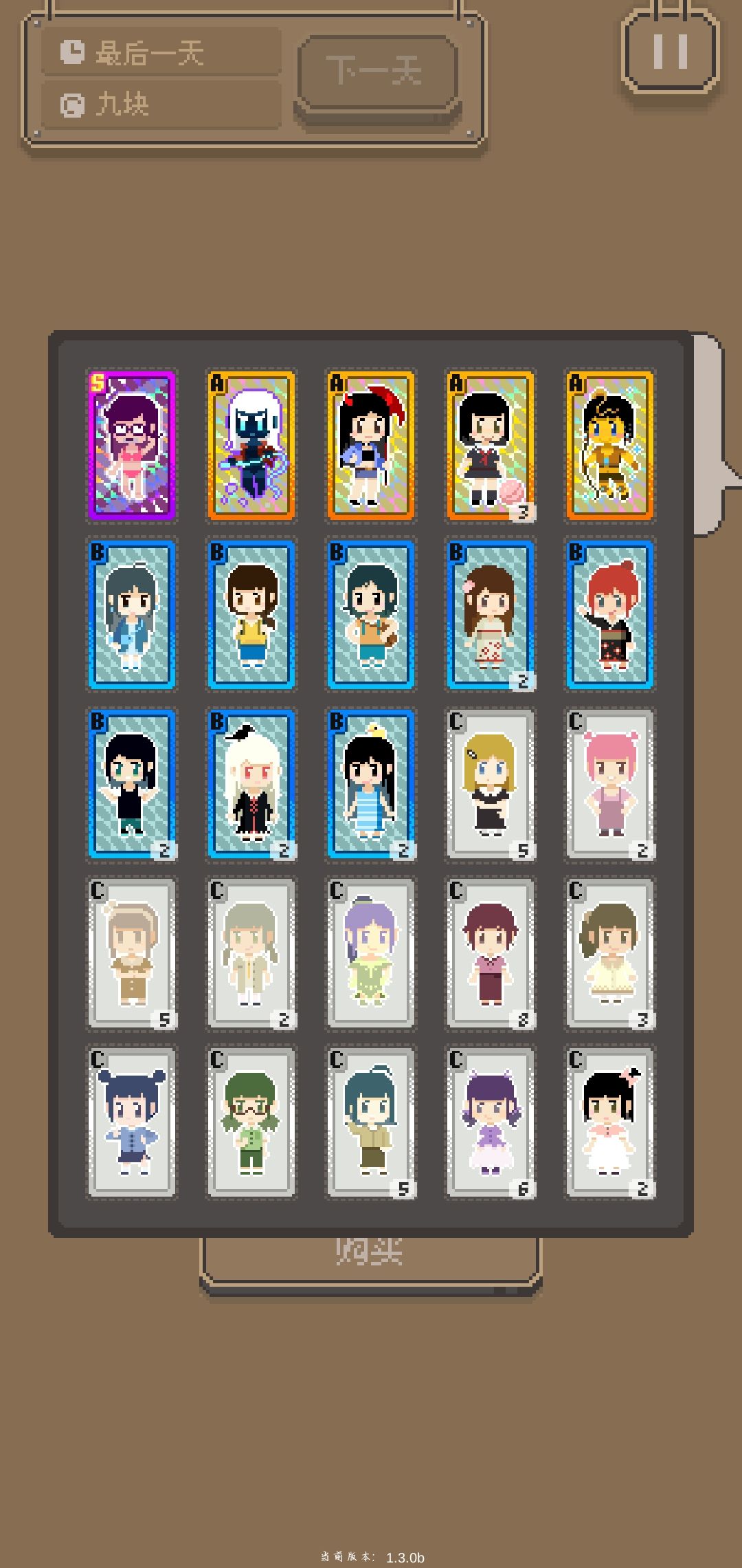 前面的那些天,就一直点下一天。如果出了事件,“!”是一定要点的,另外再看看高端商店有没有S类卡,如果有就买,没有就下一天。(A类不用买,最后一天很好抽的,如果抽不到,高端商店也有卖的)