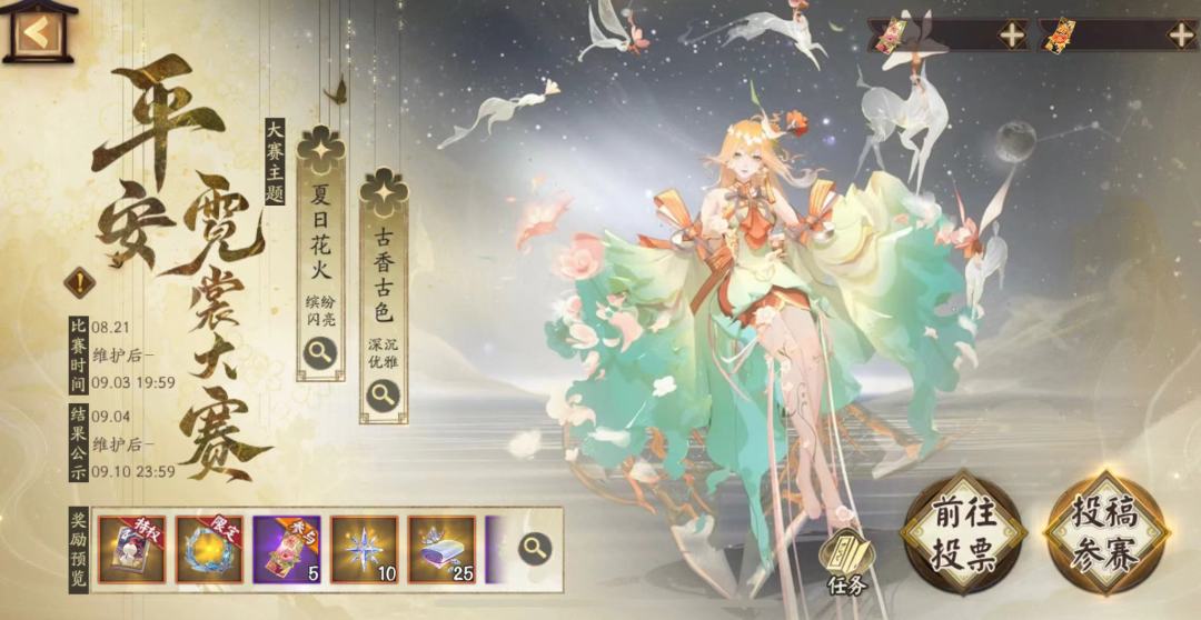 此次大赛开放8款典藏、庆典染色,分为【夏日花火】、【古色古香】两个主题赛道,大人可消耗染料道具,染制绮服华裳,在赛场上争奇斗艳。此外,本分赛场也设立了不限主题的染色赛道,大人因主题而受限的奇思妙想,可在此自由发挥,大胆点染。