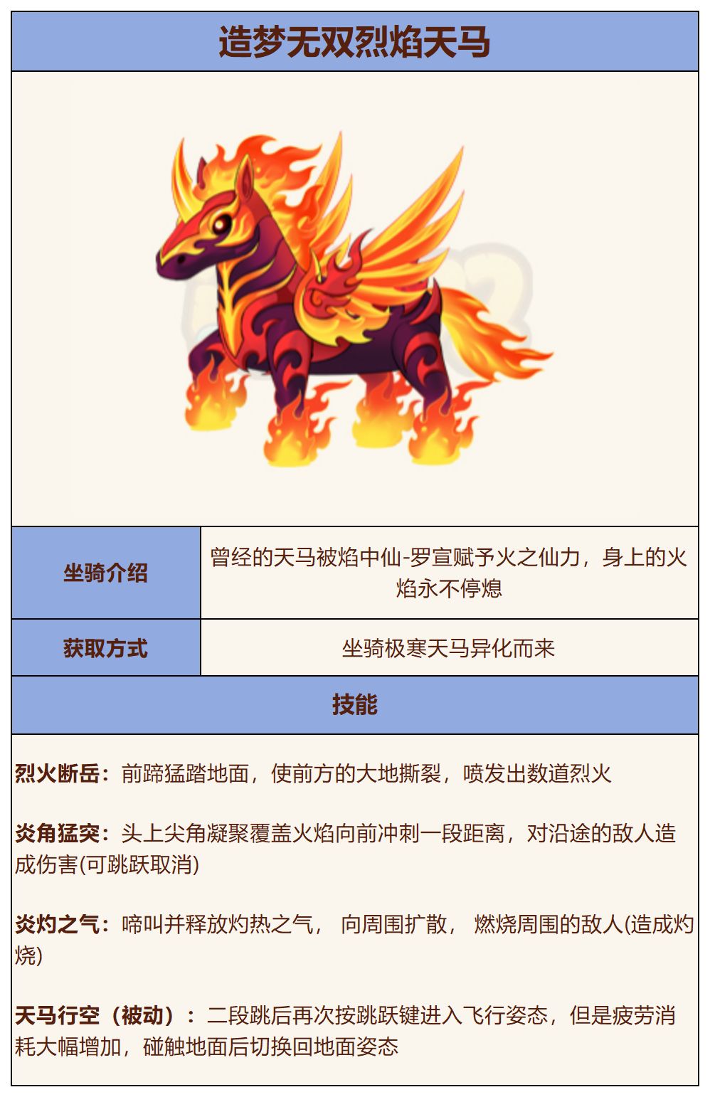 【坐骑攻略】造梦无双烈焰天马坐骑技能表