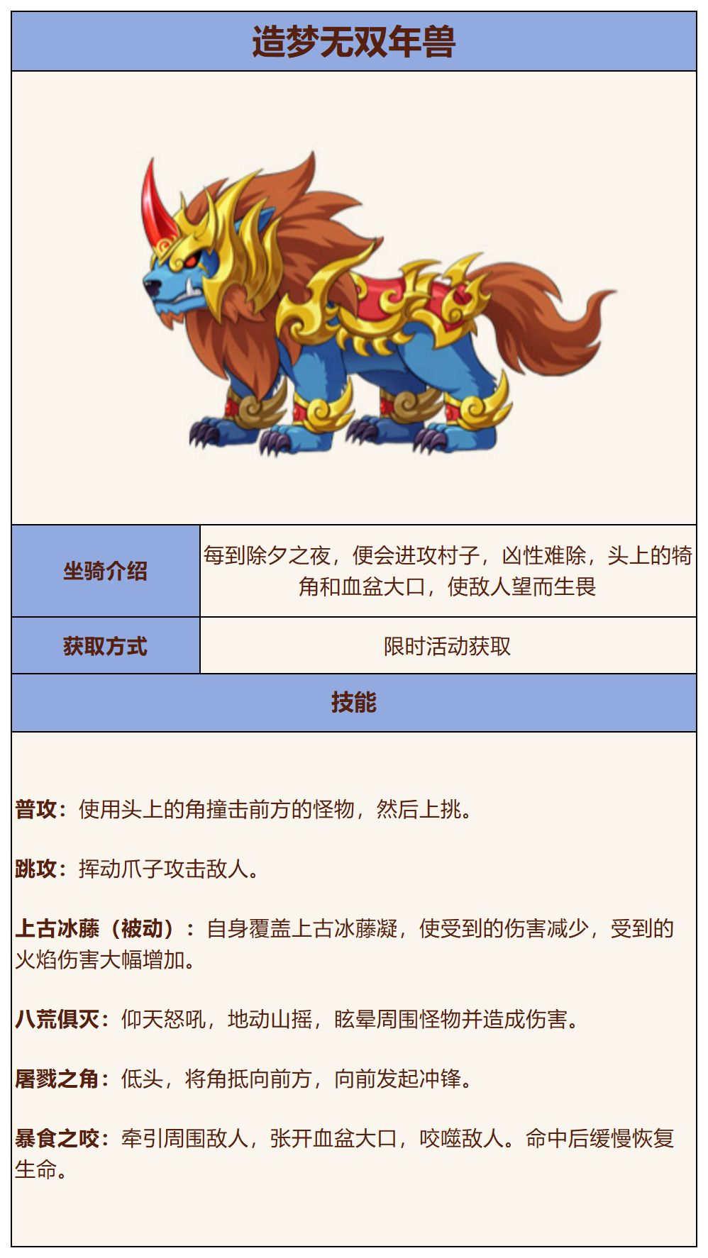 【坐骑攻略】造梦无双年兽坐骑技能表