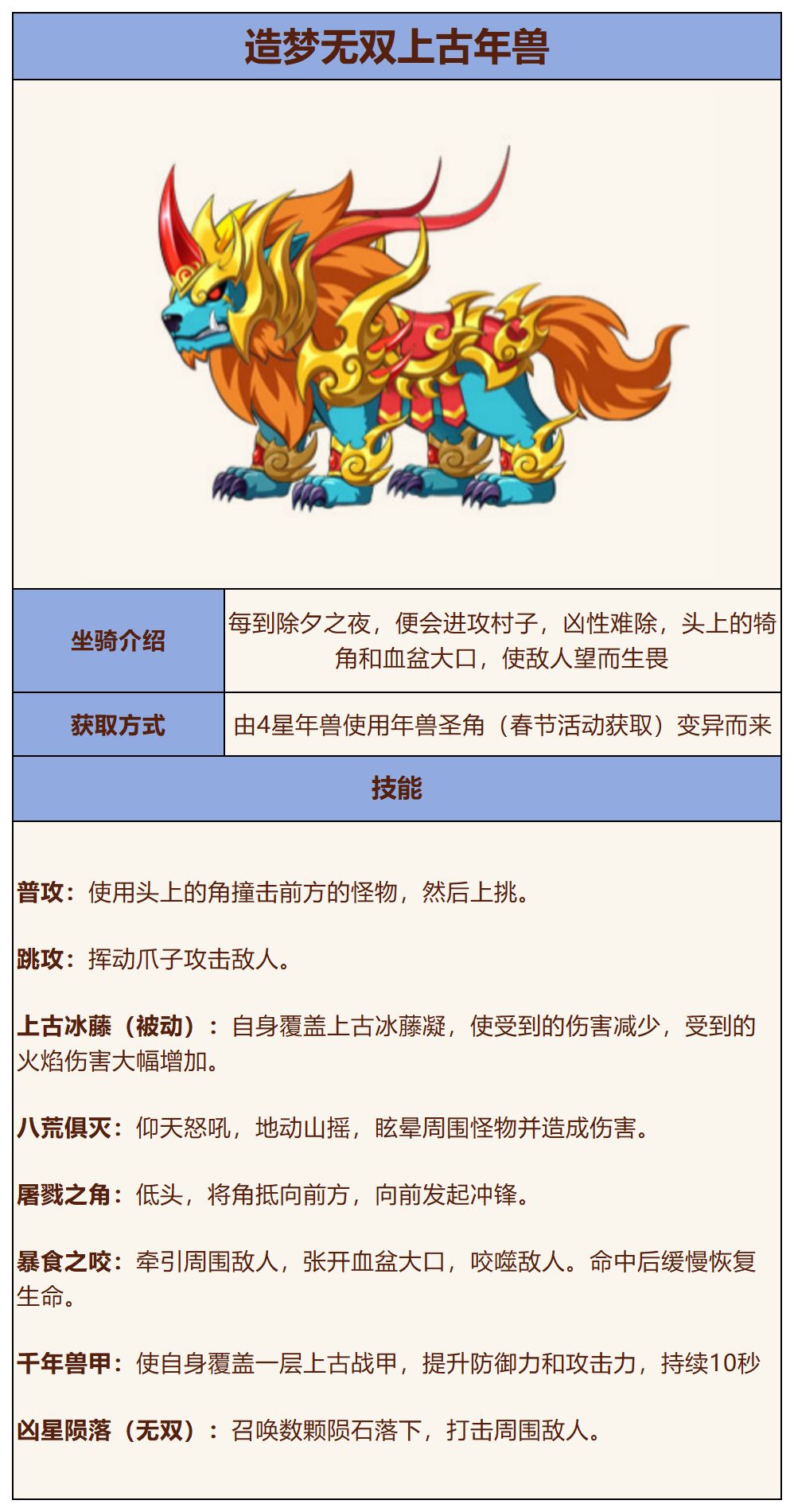 【坐骑攻略】造梦无双上古年兽坐骑技能表