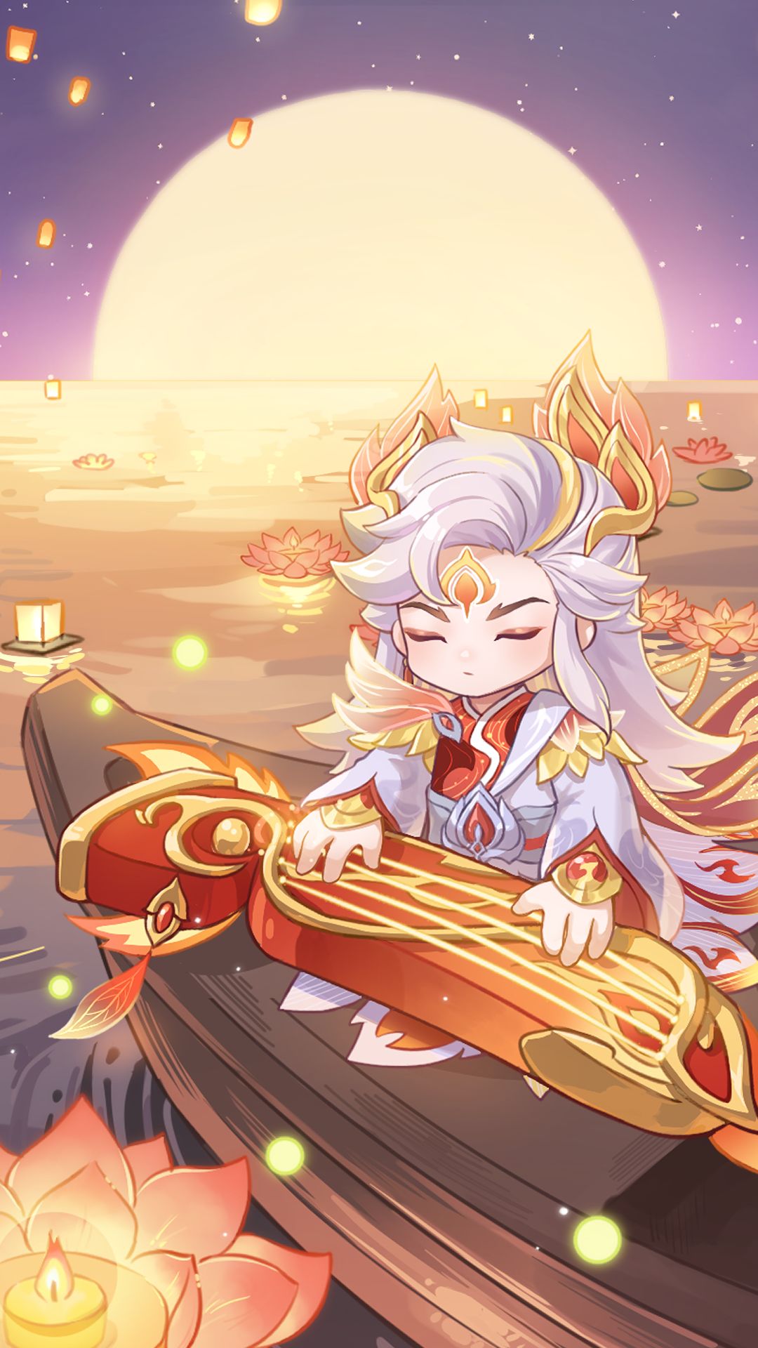 漫天明灯下,江的尽头,一弯小舟乘月而来,江水汤汤,山色苍苍,赤羽 红衣下的指尖轻抚瑶琴,音符婉转深情,似乎在诉说着对丹翎无尽的爱意。