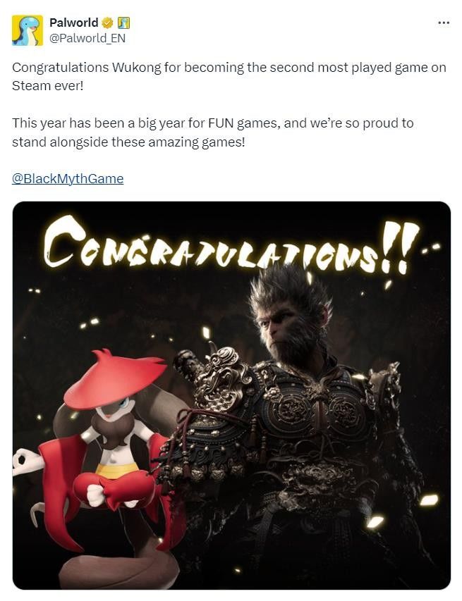 恭喜《黑神话:悟空》成为Steam历史玩家数量第二多的游戏!今年是趣味游戏大年,我们很自豪能与这些令人惊叹的游戏并肩而立!