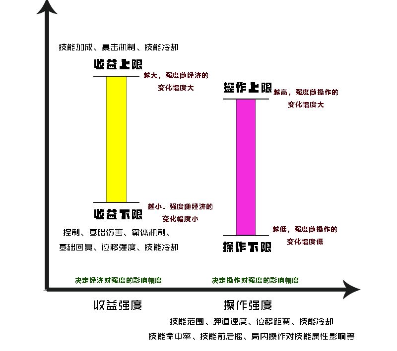 所以,大致可以将一个英雄的机制分为以下两个部分:收益强度和操作强度,英雄的基本性质由收益强度决定(即以经济为主的局势因素对于一个英雄强度的影响),而英雄的强度浮动和成长由操作强度决定(即局势变化以及个人操作水平对于一个英雄强度的影响),而收益强度和操作强度可以大致分为收益上限和收益下限以及操作上限和操作下限四个部分。