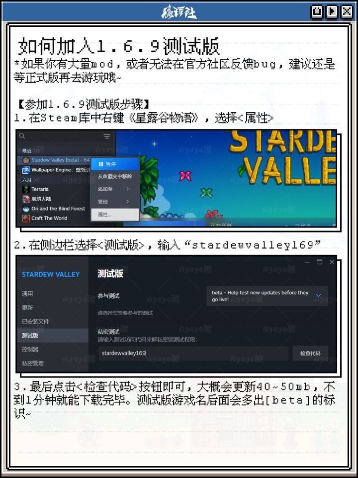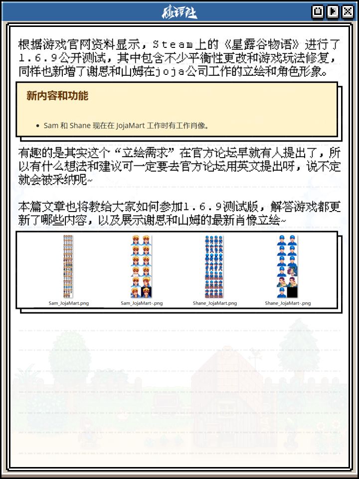 根据游戏官网资料显示,Steam上的《星露谷物语》进行了1.6.9公开测试,其中包含不少平衡性更改和游戏玩法修复,同样也新增了谢恩和山姆在joja公司工作的立绘和角色形象。