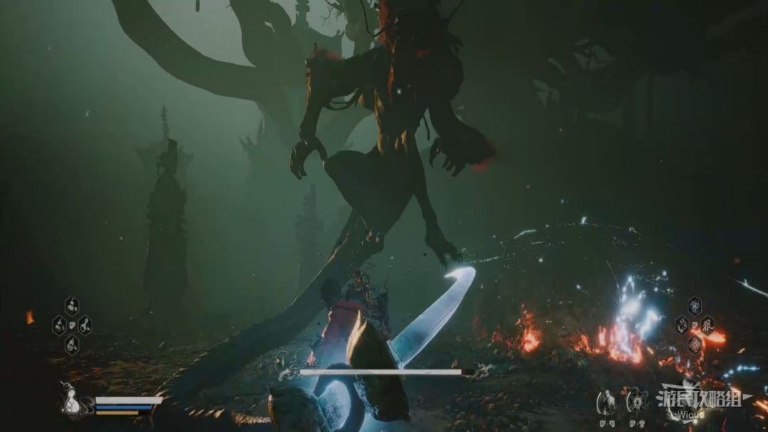 赤髯龙的主要攻击方式便是用前掌大幅度的爪击,以及用尾巴横扫后方的敌人,偶尔还会飞到天上使用雷电法术并突击到玩家旁边。总体来说很好躲,因为前摇很明显而且动作幅度都很大。
