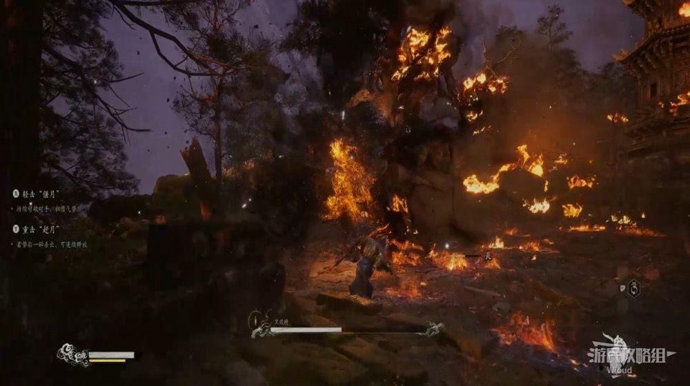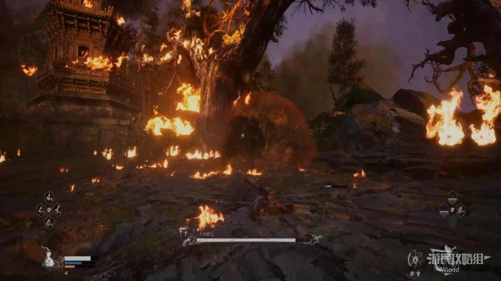 在黑熊的血量到半管及以下时,固定会幻化成一团火开始连续突刺,其机制与黑风大王的风相同,只需要在发现爆炸后翻滚即可,这场BOSS战的难度很低。