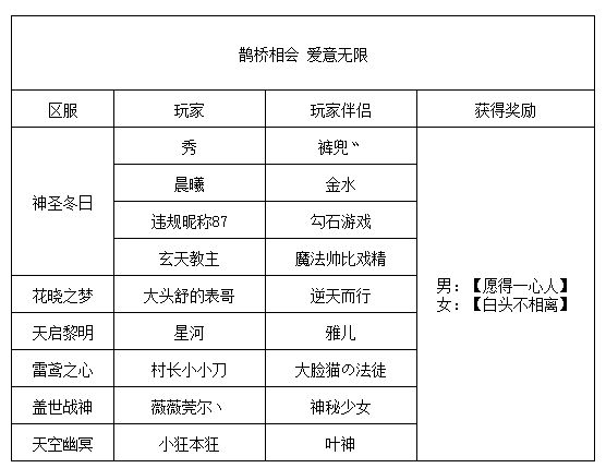 《世界ol》鹊桥相会 爱意无限获奖名单
