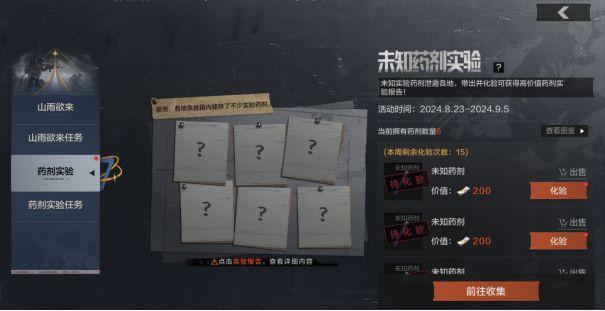 各地图内的各类【急救箱】将会出现未知实验药剂,带出实验药剂后大家需前往活动中心化验药剂,化验药剂后将会随机化验出实验报告,首次化验出效果报告可获得图鉴奖励,每周最多化验15次。