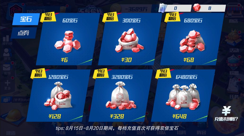 所有档位宝石充值,翻倍重置。充值6元宝石,即可获得120宝石!若首充翻倍还没有使用,即有两次翻倍机会!