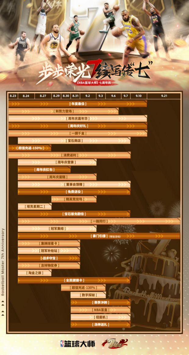时光荏苒,转眼间《NBA篮球大师》已经陪伴大家度过了七个精彩的年头!在这七年里,我们一起见证了无数的激动时刻和辉煌胜利。为了感谢各位玩家的支持与热爱,我们精心准备了一场空前盛大的七周年庆典!