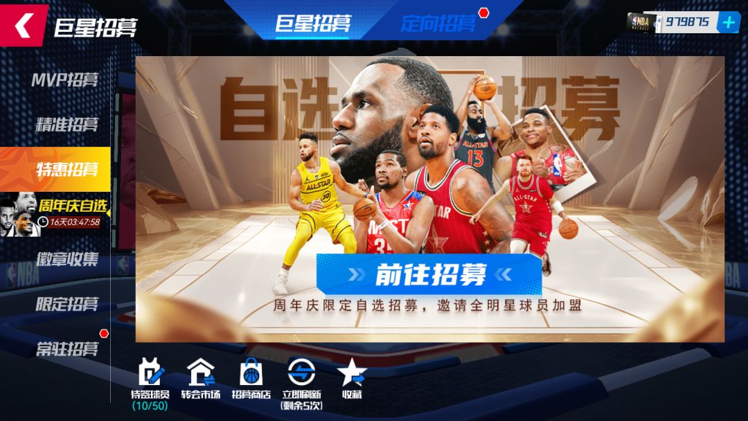 活动期间,可使用【精准招募函】在【特惠招募-周年庆自选】池中,抽取全明星自选礼盒,共计五次机会,最多开出五位全明星球员。(可开出所有全明星球员!!)