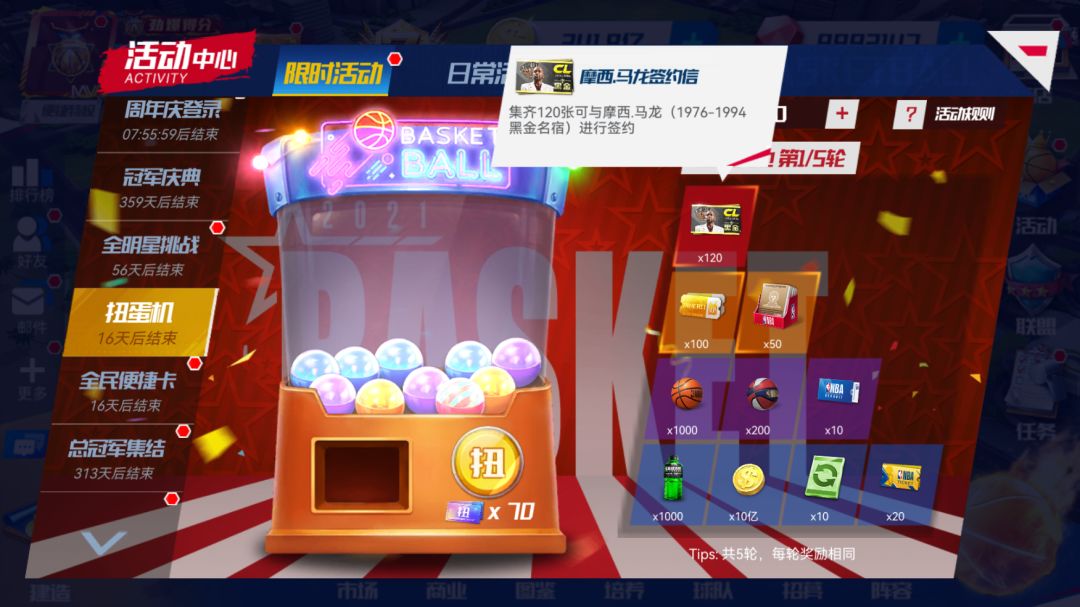 使用“扭蛋券”参与可参与抽奖,摇完扭蛋机中扭蛋,必定获得黑金名宿——摩西.马龙!