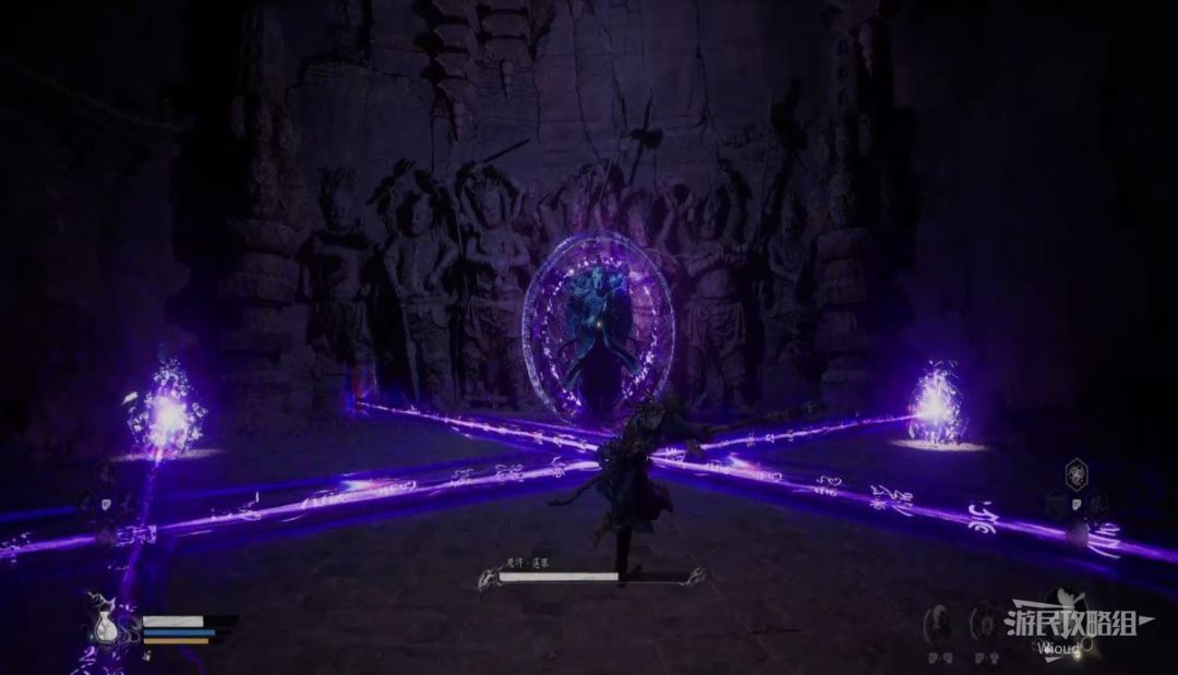 魔将莲眼主要通过法术攻击玩家,有连续的飞弹攻击、射线扫射,能够移动的光波等,初见可以先感受一下躲避的节奏,后面再着重攻击。