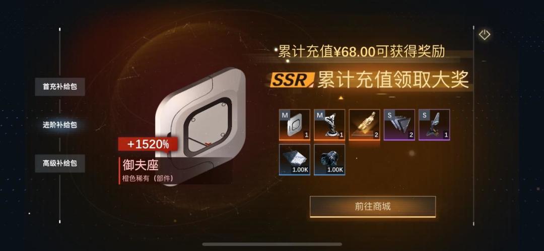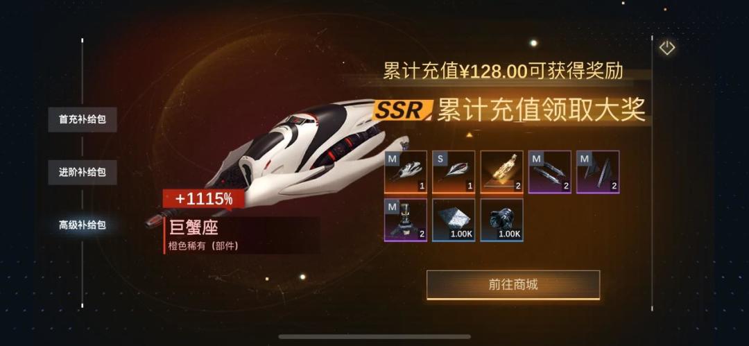 2)补给包内容:橙色M武器,S武器,橙色船体升阶材料*2,紫色部件,升级材料