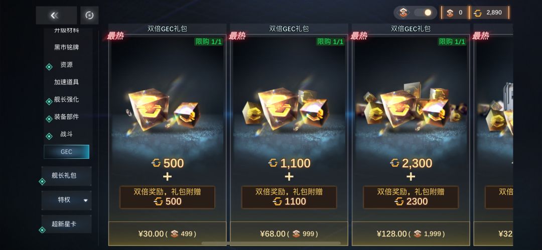 说到这里就得提一下不推荐的礼包,比如GEC礼包,同样的价格,买上面列举的礼包不但能获得更多的GEC,还能获得舰船,资源,材料等物品。